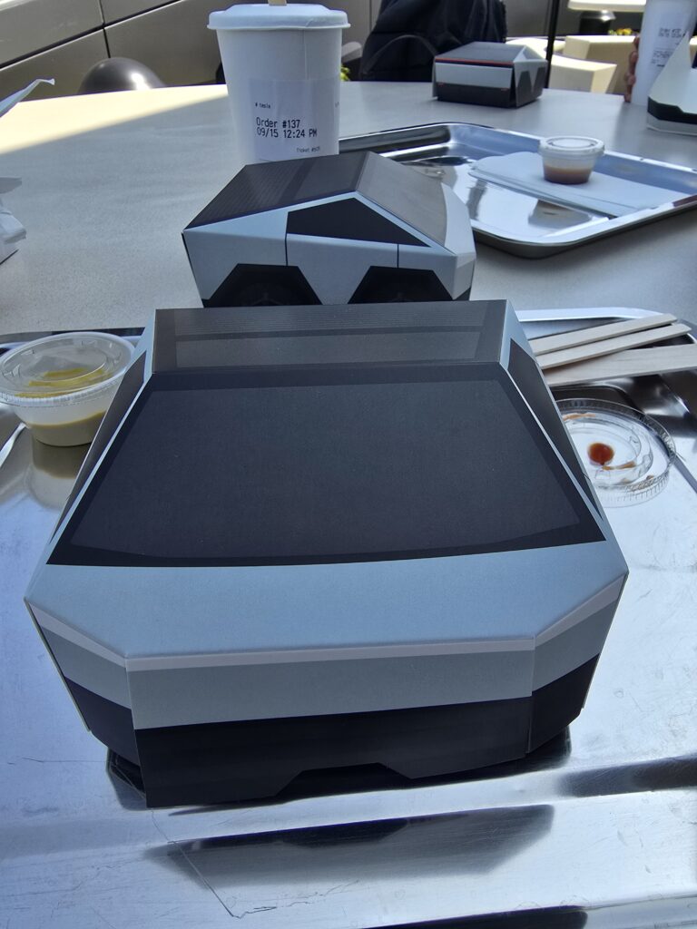 El menú, con sus clásicos americanos, ofrece variadas opciones. Nuestra familia optó por hamburguesas jugosas, ensaladas frescas, kombuchas y gaseosas. Además de su delicioso sabor, nos encantó el compromiso con el medio ambiente, evidente en todos los utensilios de bambú y reciclables. Un detalle que nos encantó: toda la comida del Tesla Diner viene servida en un innovador envase de cartón, con el diseño icónico de la Cybertruck.